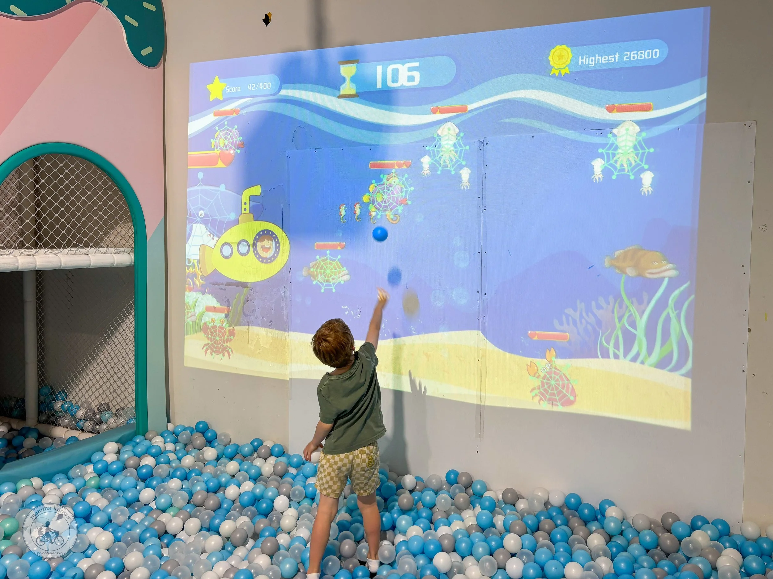 There is SO much to discover at this shiny play centre and cafe! A series of slides over a giant ball pit, an arcade style area with mini merri-go-round, giant lego, a kitchen and supermarket section complete with mini shopping trolleys and an area with interactive ball pit games projected onto the wall! Yes - you throw the balls against the wall to win points in over 100 different game options!