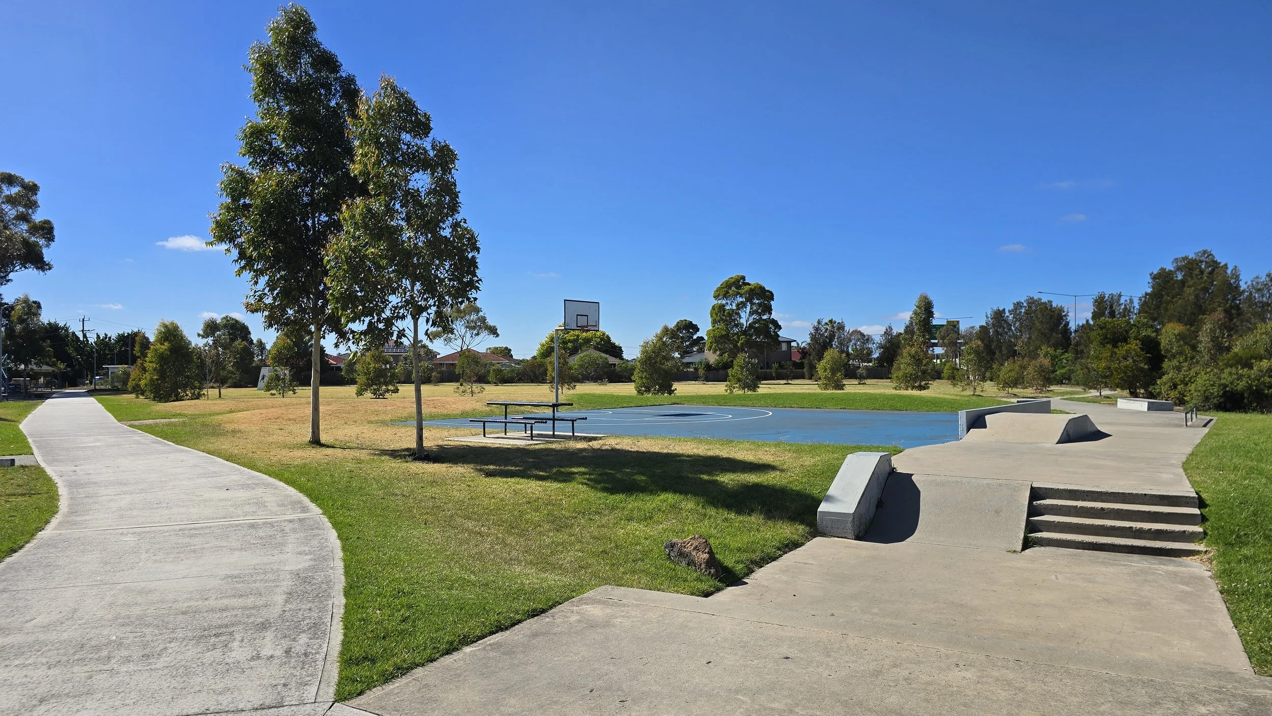 drinking fountain - undercover area - seating - dedicated carpark - fenced - toilets - bbq facilities - soccer pitch - basketball court - off lead dog area