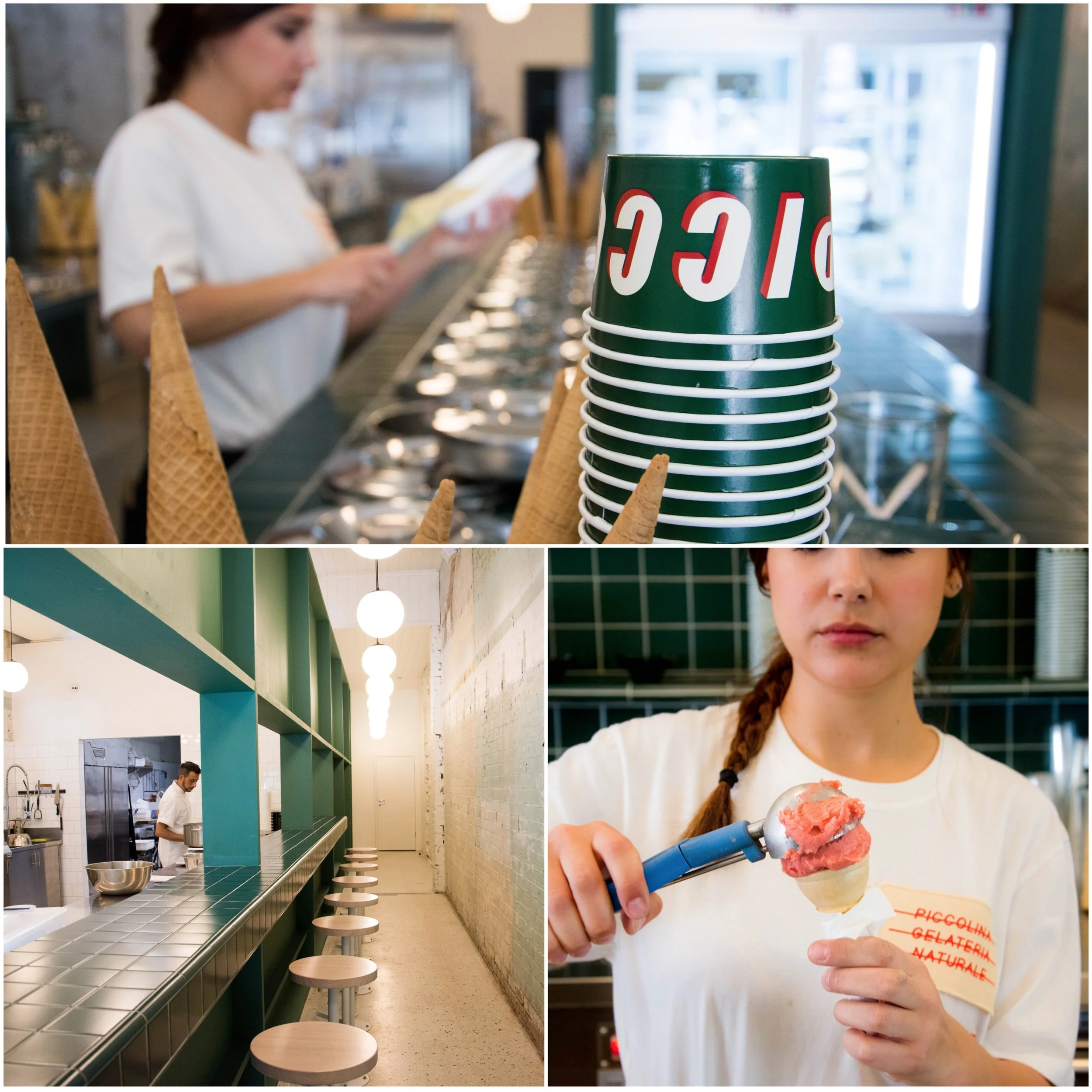 Walking into Piccolina you are transported into a dining experience like you're in downtown Italy; with raw walls, and bar stools along the bench. There are gelato makers on-site during the shops opening hours so customers can get a look at how the stuff gets made. Little Miss was in ice-cream heaven.